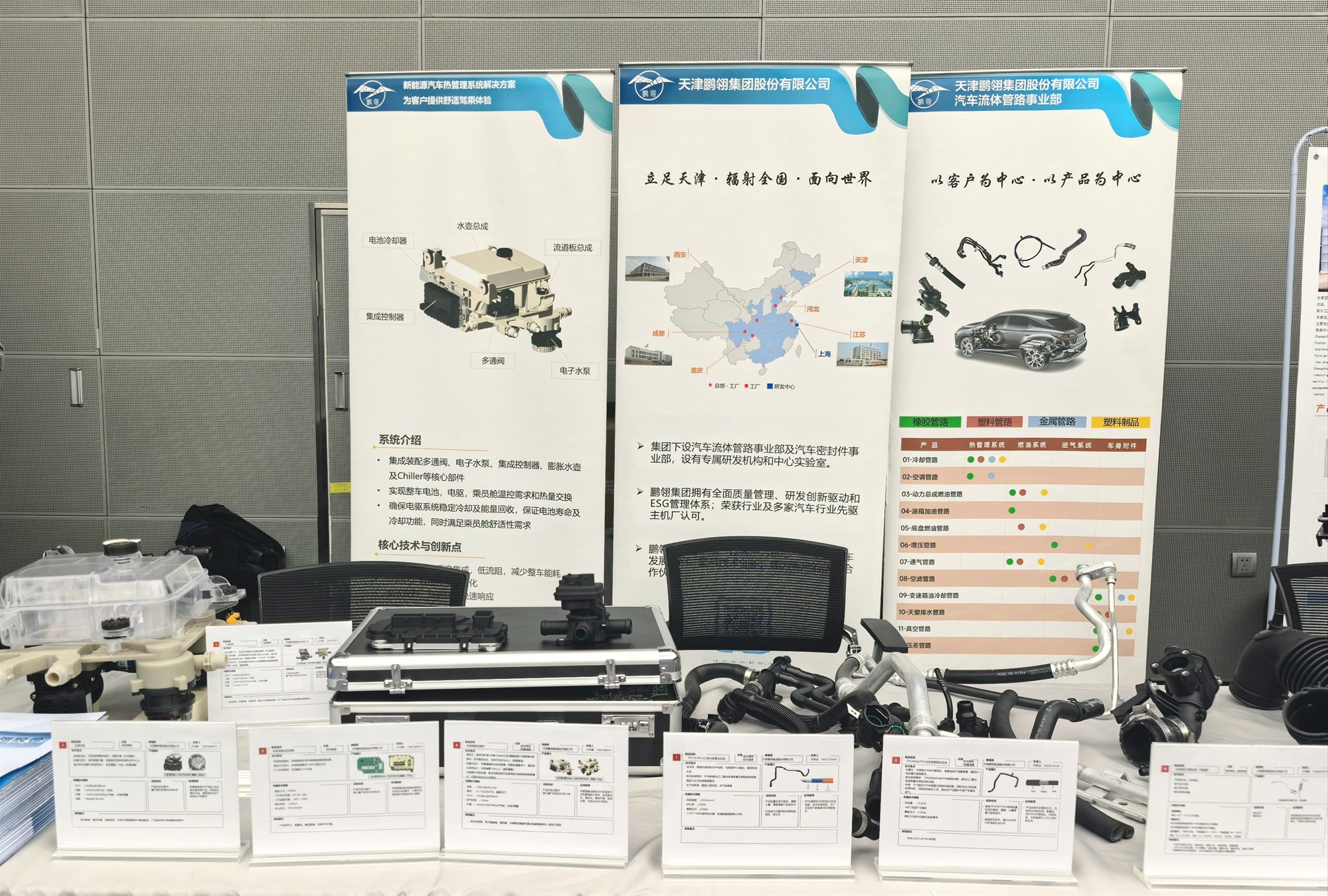 着重介绍了NVH性能优越的三层空调胶管、空间节约型的异型管结构性能及应用情况。针对冷媒变迁,自然工质冷媒空调系统预研情况,向客户展示了R744空调管路总成样件,并介绍了研发成果、专利、市场推广案例等。