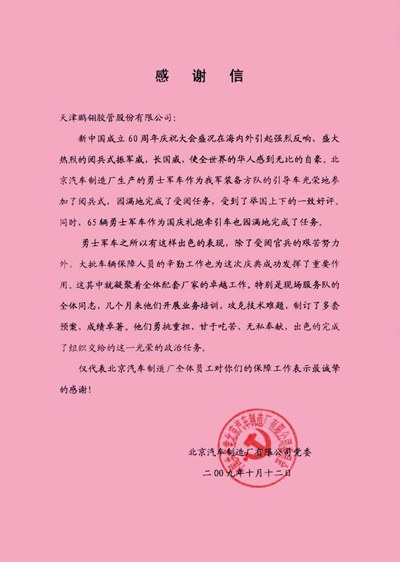 2009年10月20日,我公司收到北京汽车制造厂有限公司发来的感谢信一封,信中就亿万28官网在国庆阅兵式所用的勇士军车的整个配套保障过程中,所作出的贡献表示感谢!