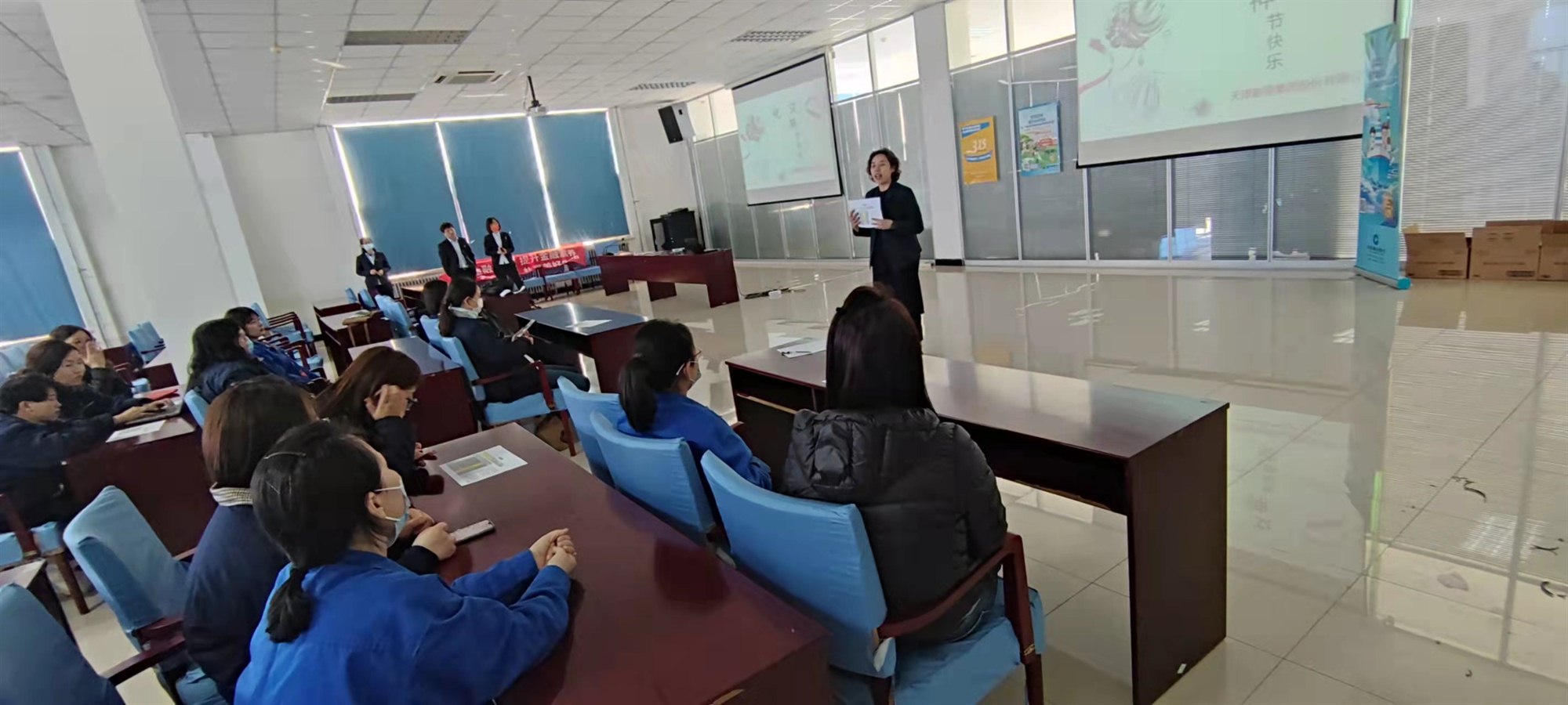 为了能让大家有一个更好的身体状态,节日当天公司举办了“关爱自己,守护健康”为主题的健康讲座。由建设银行讲师为大家介绍了风险识别及保险保障常识,随后特邀专业瑜伽老师带领大家进行了瑜伽锻炼,教授大家颈部的活动练习和瑜伽简单基础的拉伸体式练习,大家跟随着老师的动作认真学习,开始了自己身体和心灵的约会。通过课程中同事之间的相互鼓励,增进了沟通和友谊,使大家能够以平和、饱满的心态更好地投入到工作和生活中。
