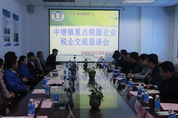 As one of the 24 tax awareness month series activity, on April 24, Lingang National Taxation Administration held Binhai New Area Zhongtang Town key tax sources enterprise symposium, the town party committee secretary Jiang Fenggang, the bureau of the party group secretary and chief Liu Jinwei, chief economist Zhang Gongxun, related department head and Pengling Co., LTD., and other seven key tax sources of corporate and financial personnel attended the meeting.